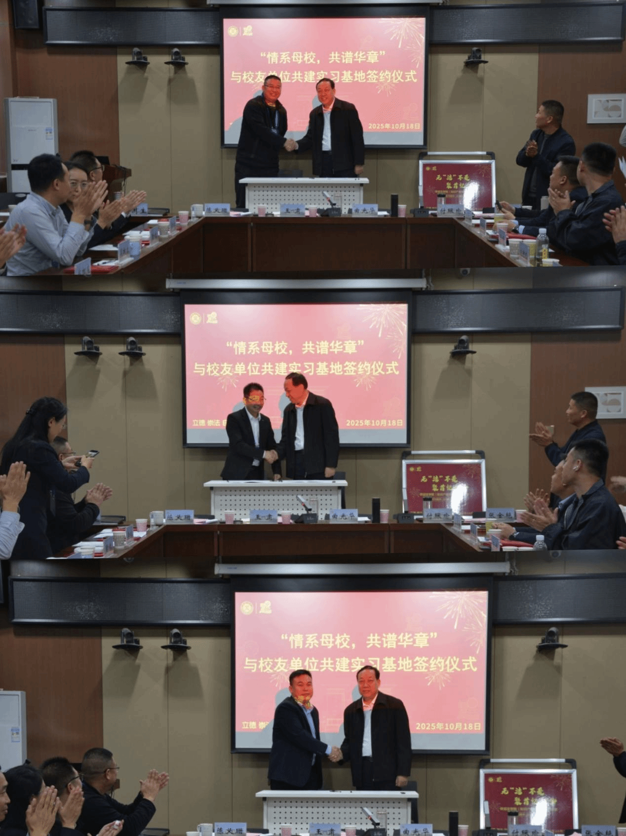 下午3:30,“情系母校,共谱华章”校友单位共建实习基地签约仪式和校友捐赠仪式如期举行。副院长付琛瑜主持。仪式上,校友李强、李勇、胡领学代表各自单位,与王肃共同签署实习基地共建协议,为学院人才培养搭建实践平台。