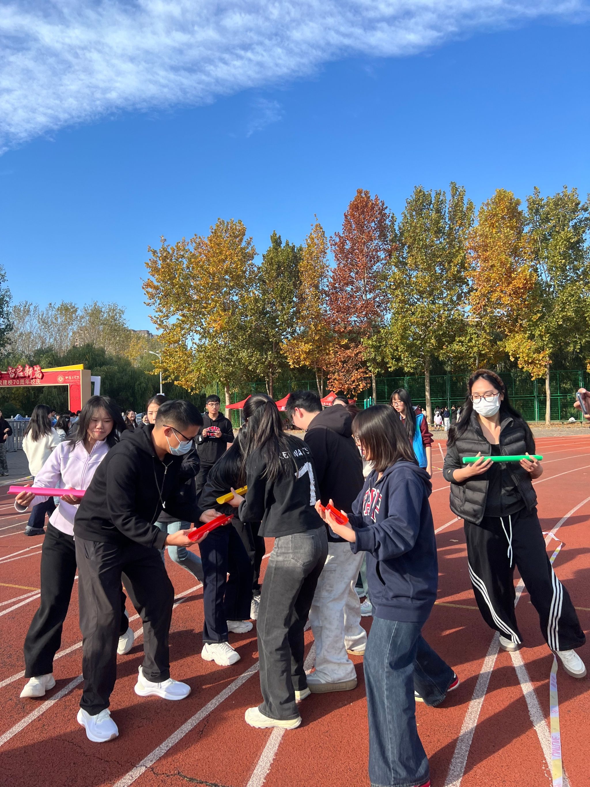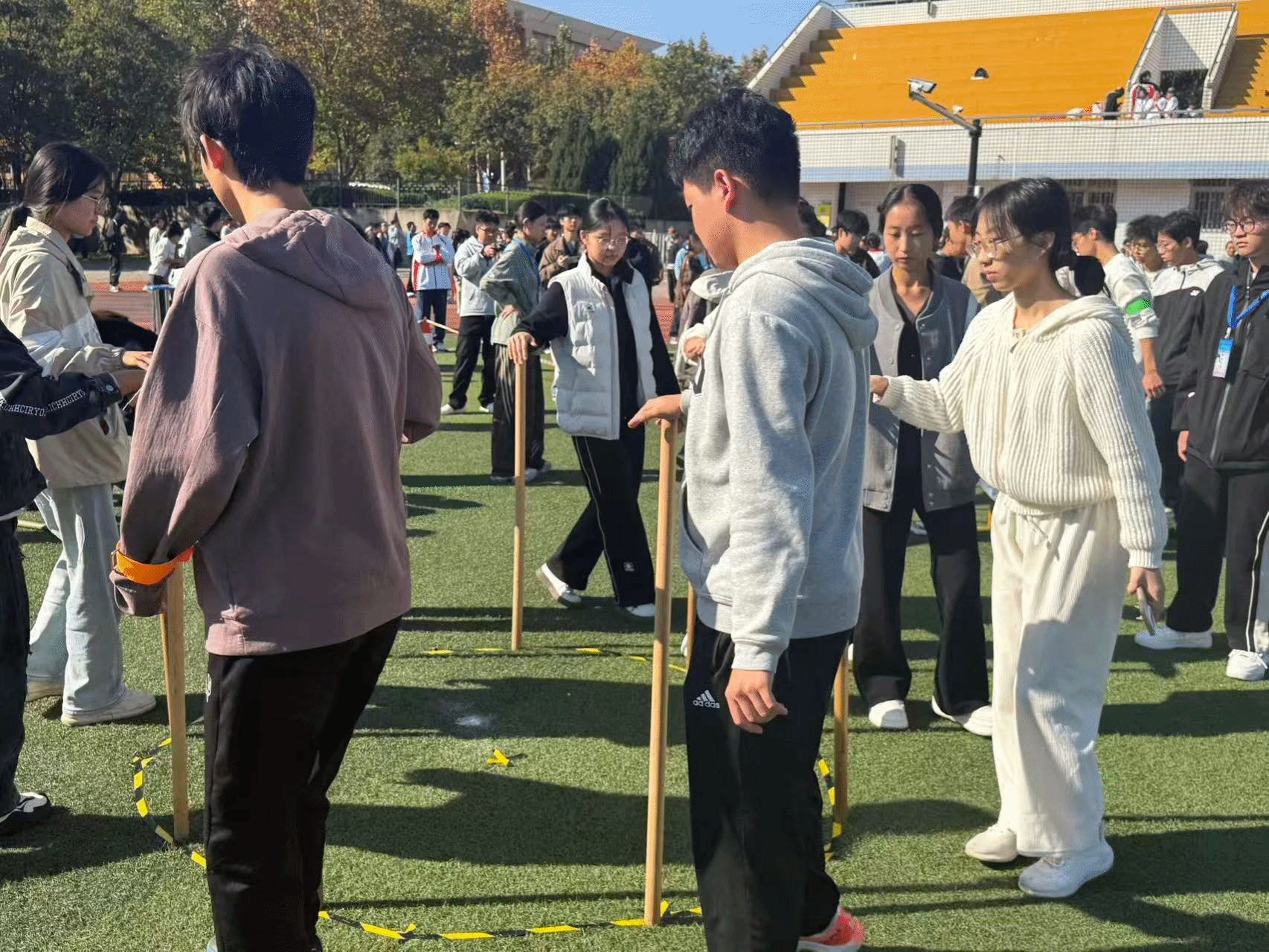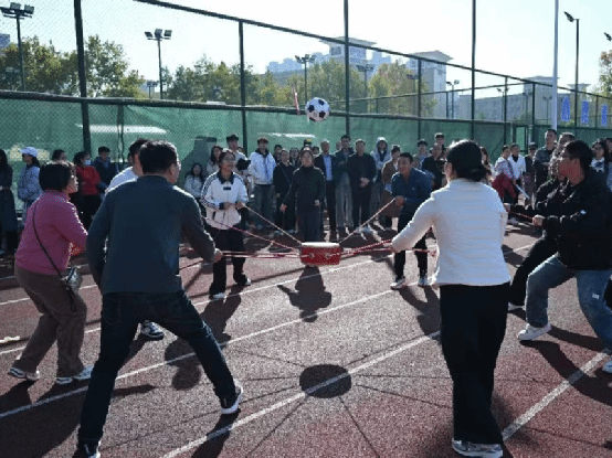 学生组的比赛项目丰富多样,涵盖了“十人九足”“不倒森林”“心灵手巧”等九个项目,全程聚焦团队协作与心态调整,每一个环节都充满了挑战与乐趣。在“十人九足”项目中,同学们相互扶持、步调一致,向着终点奋力冲刺;在“珠行万里”环节,大家精准传递,默契配合,展现出高度的团队协作精神;在“不倒森林”挑战中,同学们凝神聚力,坚守阵地,共同克服困难·····