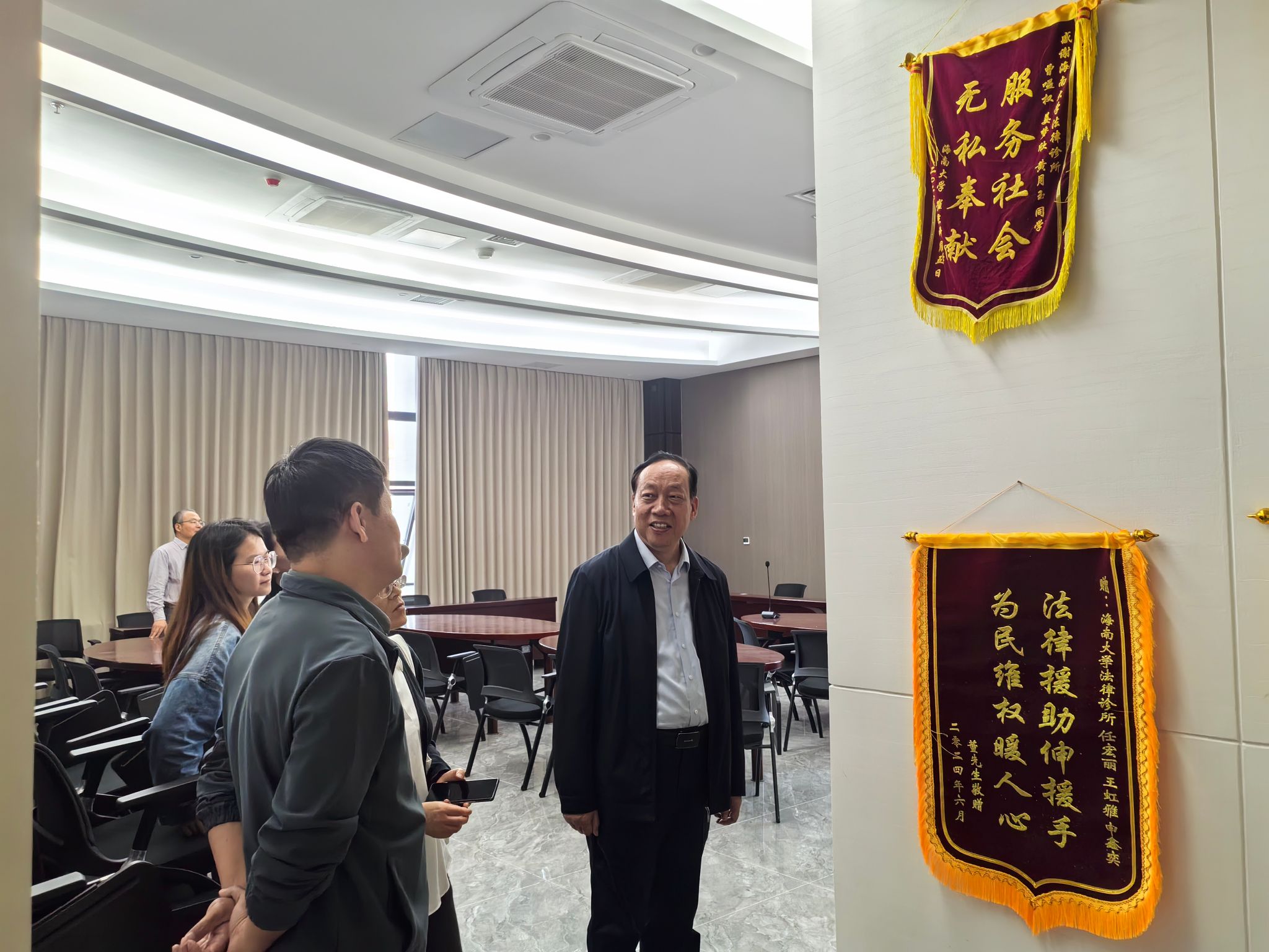 座谈会后,调研团实地参观了海南大学法学院的图书馆、学术报告厅、教授研究室及相关办公机构设置情况,重点考察了该院模拟法庭、法律诊所、模拟国际商事仲裁庭等实践教学场所,详细了解实训课程设置、案例教学开展及学生法律援助服务等情况。调研团还亲切探望了在海南大学法学院攻读博士学位的我院25届法律硕士专业毕业生纪林菲同学。