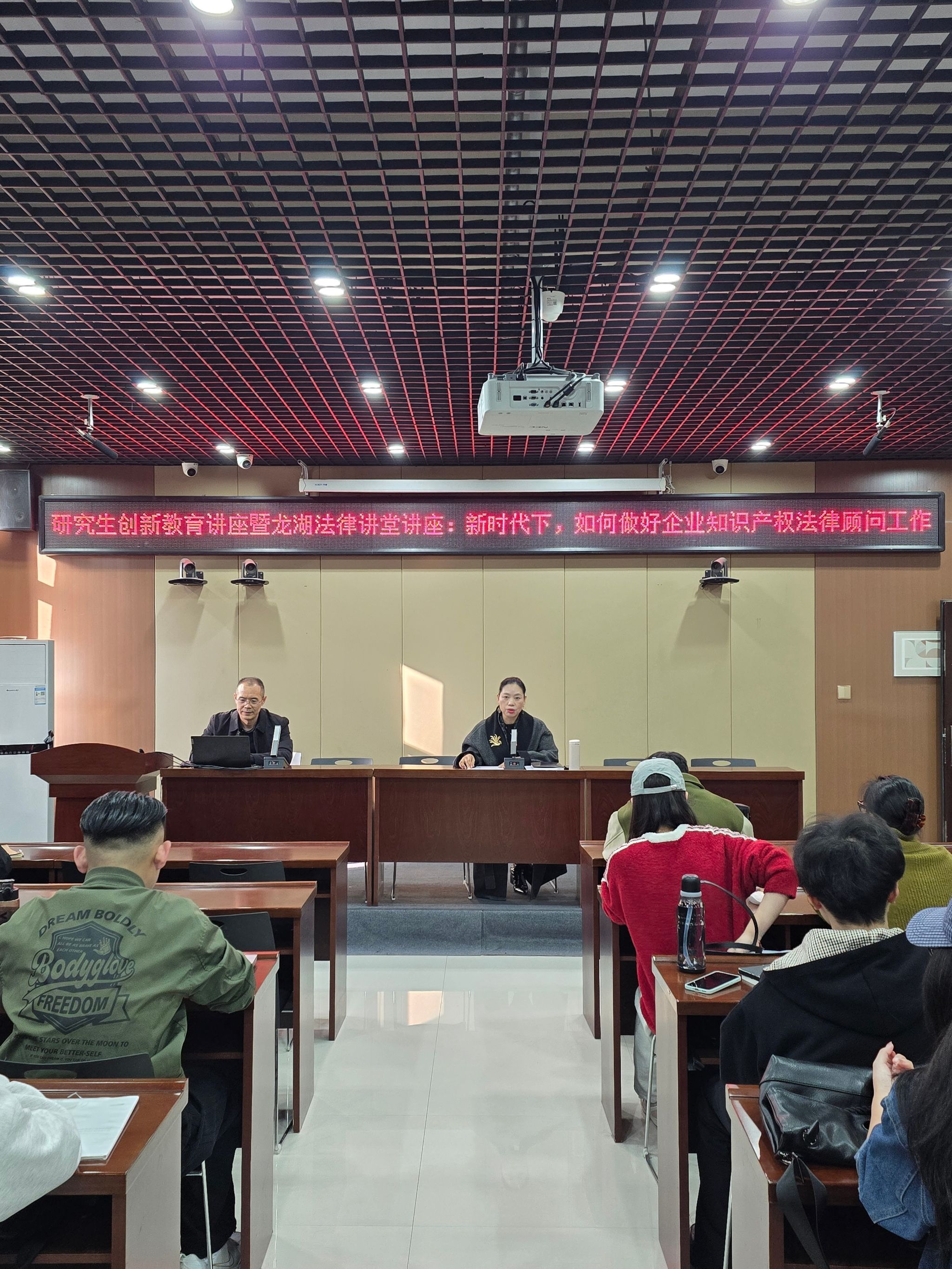 讲座上,张建东对法律服务市场面临的“新时代”背景进行深度剖析。他指出,受宏观经济形势与资源分配等因素影响,传统律师领域日趋白热化,面临转型压力。但随着国内企业“走出去”及境外设厂等刚性需求的增加,知识产权与涉外法律服务领域正迎来蓬勃兴起的“蓝海”机遇。他结合代理的纠纷案例,讲解了企业知识产权法律顾问诉讼案件办理、非诉案件办理以及辅助性需求处理等三大板块的工作要点,并特别分享了竞聘大型国企法律顾问的实用技巧。他勉励同学们在日常学习中不能局限于法学条文,更要主动涉猎人工智能、计算机等理工科知识,构建复合型知识结构,以适应未来市场的需求。