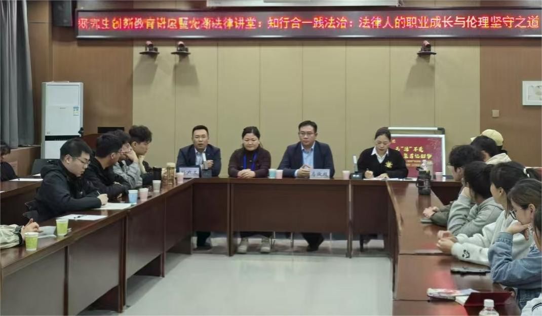 正值我校70周年校庆之际,受学院邀请,我院2005级法学本科校友、宁夏回族自治区高级人民法院知识产权审判庭副庭长唐荣,兰考县人民法院党组成员、副院长马俊超,以及我院2006级法学本科校友、浙江德凡律师事务所高级合伙人孙广文律师共同做客龙湖法律讲堂,为师生带来《知行合一践法治:法律人的职业成长与伦理坚守之道》专题讲座。本次讲座系我院研究生创新教育暨龙湖法律讲堂重要活动,由法学院(知识产权学院)副院长张金艳教授主持,学院全体研究生参加讲座。